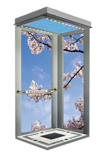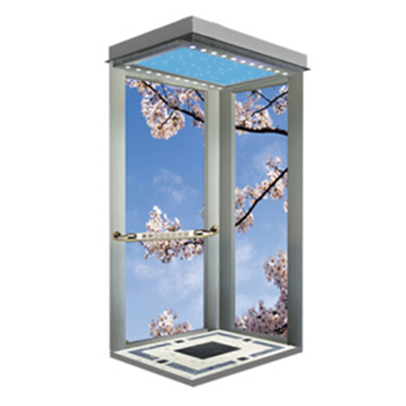 型 号:APSY-B06 主 机:曳引式 载 重:320KG/400KG/450KG 轿厢壁:不锈钢框架加透明钢化玻璃(或加夹丝玻璃) 吊 顶:钢板烤漆框架两侧圆形亚克力灯饰,中间星空亚克力灯饰 扶 手:可选 地 板:PVC地板(可选)
