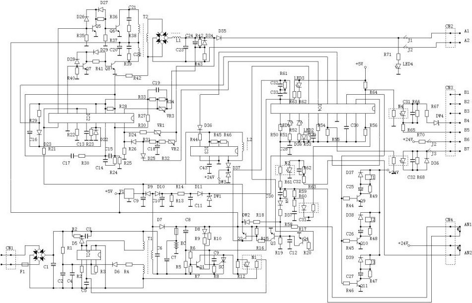 电梯电子式松闸装置的电原理图如图所示。图中CN1为220V市电输入插座,CN2为抱闸线圈插座,CN3为控制线插座,CN4为应急启动按键插座。IC1、T1、Q1、N1等构成开关电源给电池充电。电池选用镍铬电池,该电池具有体积小、重量轻、使用寿命长的特点。IC4具有接收发送各种指令功能并能产生高频振荡信号。IC3将电池12V直流电压提升到24V直流电压。IC2一方面作为Q6、Q8的高频信号推动。高频信号来自IC4。另一方面可调整应急输出的电压和电流大小。