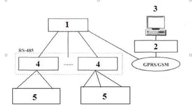 本科研项目目的的实现、功能特点及有益效果,下面将结合具体实施例以及附图做进一步的说明。GPRS/GSM的电梯远程监控故障报警系统,包括前端数据采集控制终端、GSM/GPRS数据传输单元和远程监控中心,前端数据采集控制终端定时采集电梯的运行状态数据,并通过GSM/GPRS数据传输单元将这些采集到的数据发送给远程监控中心;数据采集控制终端包括用于采样、控制的单片机1.1以及与其连接的GPRS无线通信装置1.2、喷淋控制装置1.6(现有技术结构)。在楼层的不同位置安装多个烟雾探测器5,每个楼层设置电梯控制器4,所述电梯控制器分别与相应楼层的烟雾探测器连接,接收烟雾探测器的检测信号;所述数据采集控制终端通过RS-485接口连接到电梯控制器。