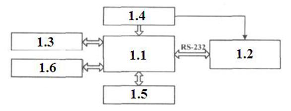 附图中标记的说明如下:1-数据采集控制终端、2-GSM/GPRS数据传输单元、3-远程监控中心、4-电梯控制器、5-烟雾探测器、 1.1-单片机、1.2-GPRS无线通信装置、1.3-定时复位系统、1.4-电源系统、1.5-RS-485接口、1.6-喷淋控制装置。